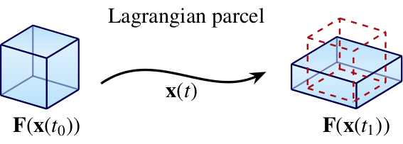 A Lagrangian parcel refers to a small, moving material volume that is followed through time as it flows within e.g. a glacier or ice sheet, unlike the Eulerian perspective which focuses on fixed locations in space. A Lagrangian description is well-suited for studying CPO evolution along a flow line \({\bf x}(t)\) if the thermomechanical background conditions are approximately steady; that is, the velocity, temperature, and stress fields are constant in time, though not necessarily in space. By treating each parcel as a discrete entity with its own microstructural state that updates with time, a Lagrangian parcel model is a particularly simply way to estimate CPO evolution and to calculate CPO-induced quantities along a flow line (trajectory), such as mechanical or dielectric anisotropy.